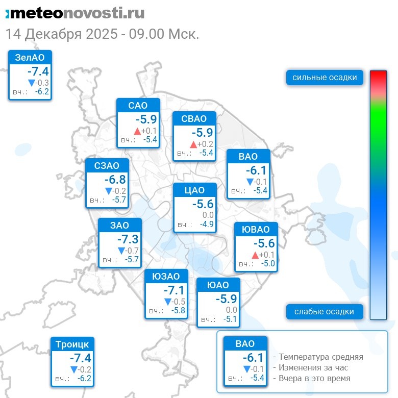 В 9:00 в Москве было от -8.2°C до -5.1°C, средняя температура -6.3°C #погода #Москва #зима #температура #14декабря #воскресенье