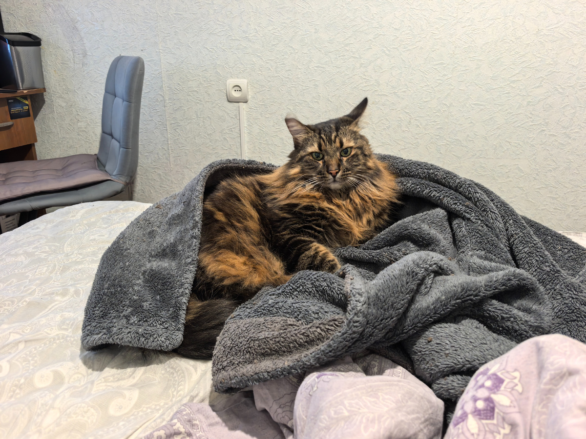 Всем привет! С вами Кузя Кусалочкин (он же царь Кузьма I). Сегодня расскажу, как мы с хозяйкой ленились. Утром хозяйка хотела дольше поспать. А в мои планы входило поесть вовремя паштет. Поэтому ровно в 6:45 я пришёл к хозяйке. А она понимала, что я не отстану, встала и дала мне паштет, потом пошла дальше спать. На новые каналы я сейчас не подписываюсь. Дружить, забежать в гости времени нет. Хозяин встал пораньше, пошёл посуду перемывать и кофе хозяйке сделал. А хозяйка решила дольше поспать. Надоело ей рано вставать каждый день. Потом хозяин развёл бурную деятельность, начал подбивать кабель от интернета, чтобы он по полу не валялся. Ну а мне же интересно было, стал наблюдать. Всё сделал хозяин, собрался и ушёл. Они договорились с товарищами с работы встретиться в кафе. Обещал вкусняшки принести. Ну а мы с хозяйкой дома остались, ленились. Хозяйка под одеялом лежала, а я на халатике: Но бдительность не терял. Уши всегда всё слушают. Так и лежали с хозяйкой. Хозяина долго дома не