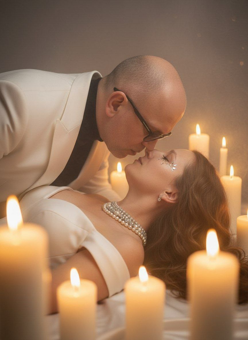 Создай портрет, не меняя черты лица. Крупный план (close-up) романтической сцены, пара целуется в теплом, интимном освещении. Мужчина в белом смокинге или костюме, наклоняется, чтобы поцеловать женщину, лежащую на спине. Женщина в элегантном белом платье с открытыми плечами, на шее многослойное жемчужное или бриллиантовое ожерелье. Волосы волнистые и длинные. На лице женщины декоративные стразы или жемчужины вокруг глаз. Вокруг множество горящих белых свечей разной высоты, создающих мягкое, золотисто-оранжевое свечение и атмосферу тумана или дымки. Сильное боке на переднем плане от свечей. Драматический, чувственный, кинематографический стиль. Высокое разрешение, профессиональная студийная фотография Эффект легкого дыма или тумана, мягкий фокус. Стиль: Венецианское барокко / Dark Academia Romance. Снимок сделан на 85mm объектив, глубина резкости (DOF). Промт и боты Nano Banana👇👇👇 https://t.me/nanobanana_promt/23 https://dzen.ru/nanobanana_promt