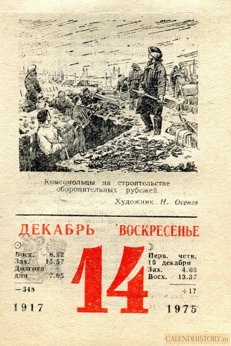 Листок советского отрывного календаря 50-летней давности 14 декабря 1975-го года — Календарь для женщин Комсомольцы на строительстве оборонительных рубежей. Художник Н. Осенев Больше старых советских отрывных календарей смотрите у нас на сайте - calendhistory.ru https://calendhistory.ru/14-dekabrja-1975-go-goda-kalendar-dlja-zhenshhin/