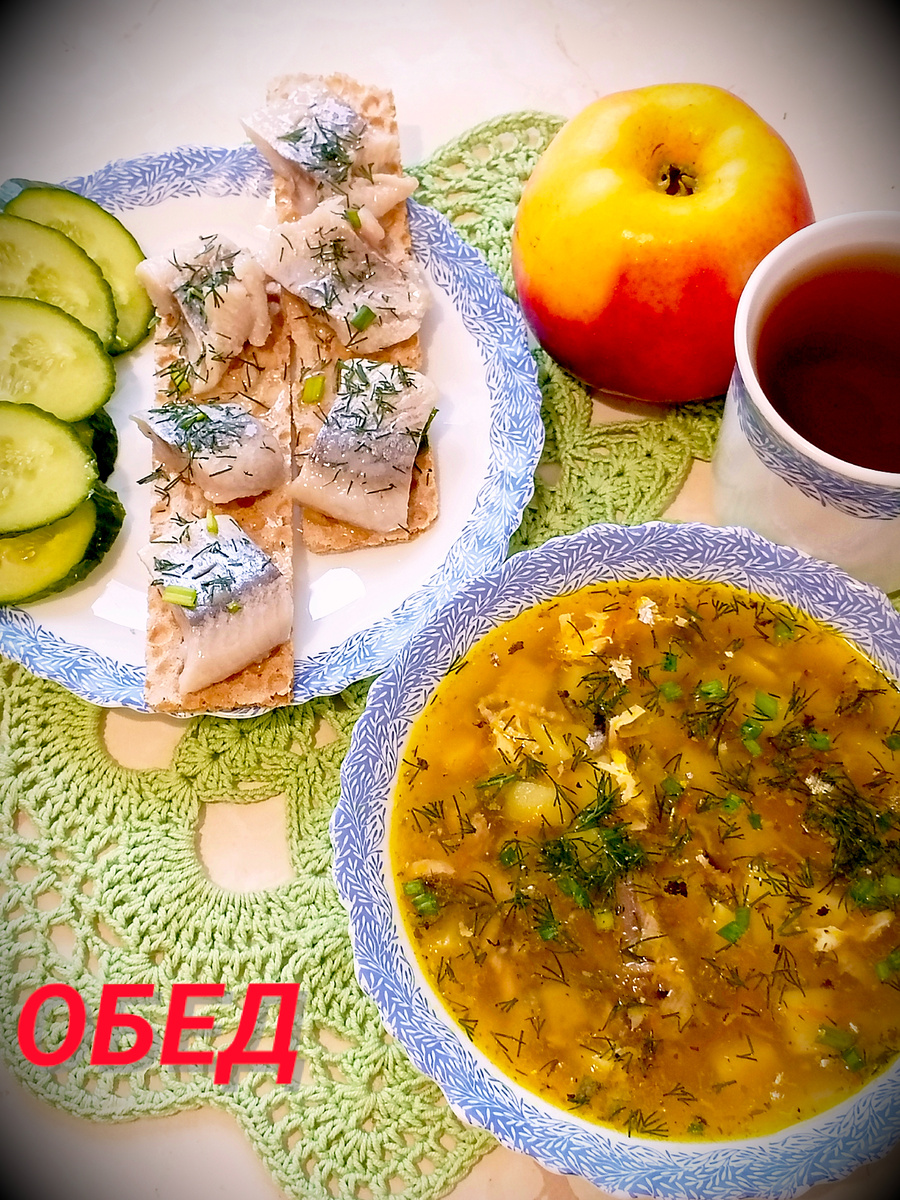 Сегодняшний день объявляю моим личным рыбным днем! Неважно, что воскресенье, а не четверг – душа попросила именно этого. 😉 Те, кто разделяет мою любовь к селёдке и наваристому супу из консервов, наверняка меня поймут. А я – большая поклонница и того, и другого! Мой воскресный обед сегодня – это: ароматный суп с рыбными консервами, сытные бутерброды на ржаных хлебцах с аппетитной селёдкой, освежающий огурчик и, конечно, чай. А на десерт, как приятное завершение трапезы, – большое яблоко, нарезанное на дольки. Буду наслаждаться каждым сладким кусочком!