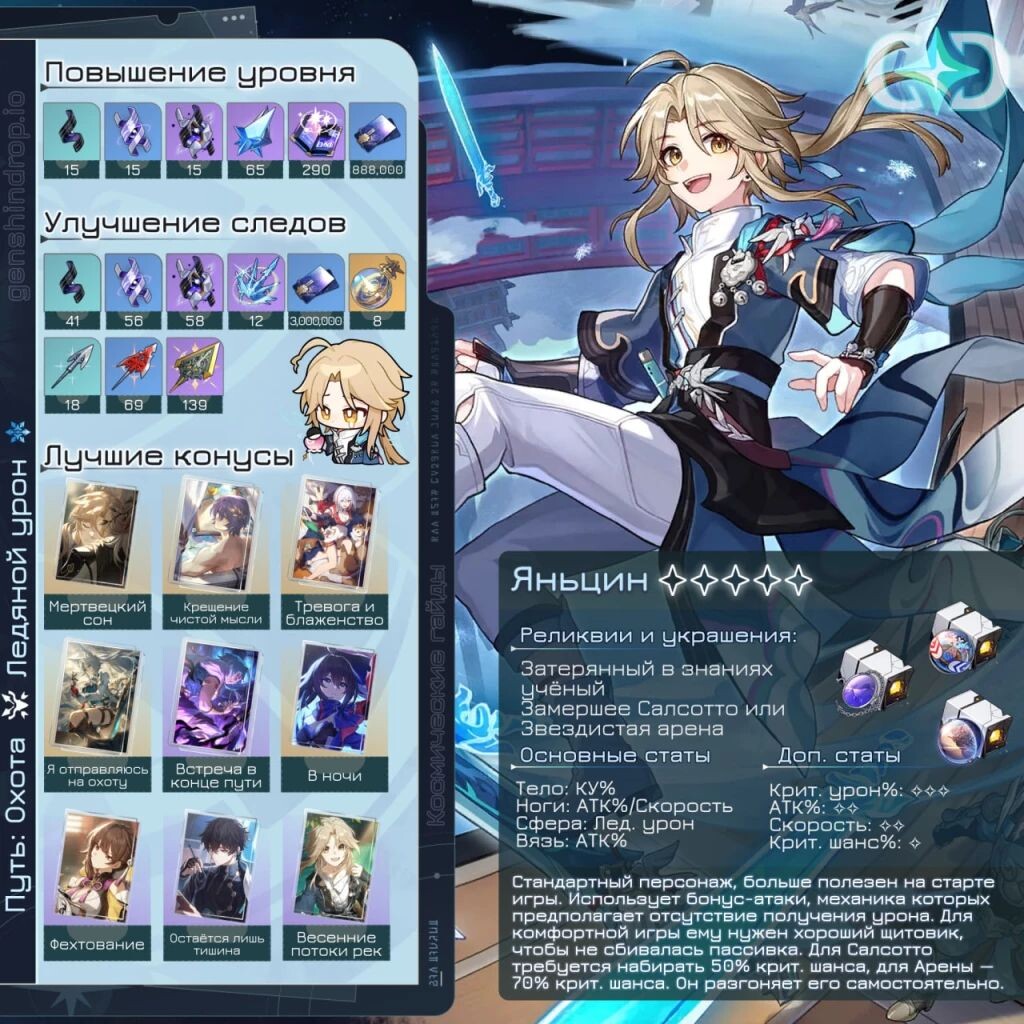 ㅤЯньцин — стандартный персонаж игры, которого можно получить при проигрыше или из стандартного баннера. Это Ледяной дамагер, следующий Пути Охоты. Его геймплей может показаться не таким простым, но на деле он гораздо проще, если уделить внимание сборке и отряду.