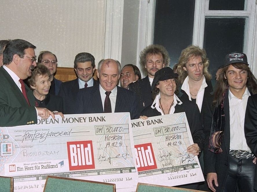 На представленной фотографии запечатлён момент, когда 14 декабря 1991 года, всего через шесть дней после подписания Беловежского соглашения, уничтожившего СССР, Горбачёв, ещё формально оставаясь президентом СССР, радостно улыбается и держит в руках чеки, полученные им от известной рок-группы из Германии Scorpions. Но обо всём по порядку. Итак, казалось бы, в те декабрьские дни 1991 года, наша Советская Родина переживала один из самых трагических моментов в своей истории, но у президента СССР Горбачева настроение было совсем не похоронное, а напротив, - приподнятое и весёлое. И почему же Горбачёв был в таком благостном настроении? А все дело было в том, что 14 декабря 1991 года в Кремль, по приглашению Горбачёва, приехала группа Scorpions. И спела ему и его супруге Раисе Максимовне песню с многозначительным названием «Winds of change» ("Ветер перемен"), которая с учётом подписанного Беловежского соглашения – прозвучала самым настоящим издевательством над СССР. Но только не для Горбач