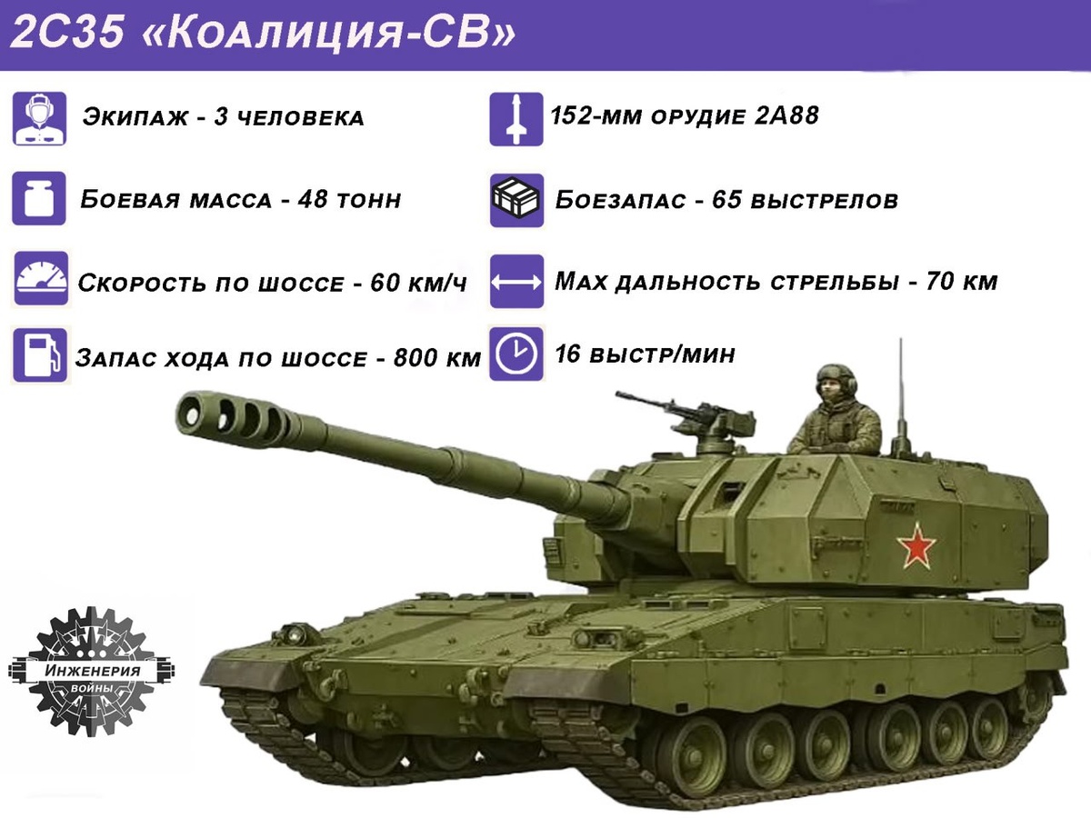 2С35 "Коалиция-СВ" - новое поколение ствольной отечественной артиллерии Отличительной чертой САУ является высокий уровень автоматизации - экипаж располагается в изолированной бронекапсуле и оттуда дистанционно управляет боевой машиной ⚠️ Предназначена для уничтожения: ► тактических ядерных средств ► артиллерийских и миномётных батарей ► танков и другой бронированной техники ► противотанковых средств ► живой силы ► средств ПВО и ПРО ► пунктов управления ► полевых фортификационных сооружений ► препятствования манёврам резервов противника в глубине его обороны Инженерия войны⚔️