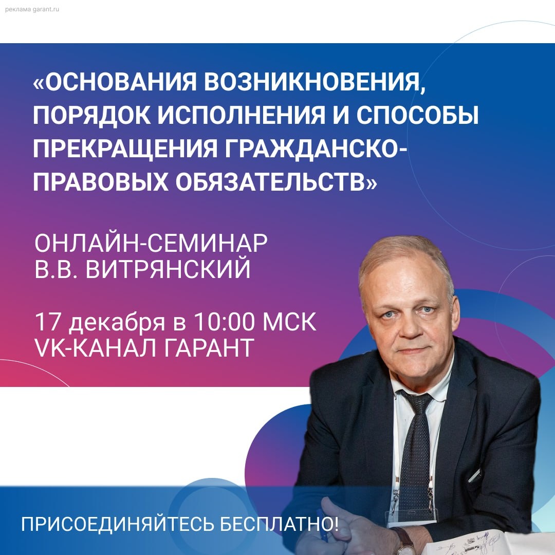 🌐 Приглашаем на онлайн-трансляцию семинара Витрянского Василия Владимировича, д.ю.н., профессора, заслуженного юриста РФ, автора более 30 монографий и 350 публикаций по вопросам гражданского законодательства. 🏁 17 декабря, начало 10:00 мск. 🤩 Участие бесплатное. Вас ждет: ⏺ интересный разбор заявленной темы; ⏺ ответы эксперта на ваши вопросы в прямом эфире; ⏺ раздаточный материал; ⏺ электронный сертификат об участии в семинаре. ✅ Предварительная регистрация обязательна 👈