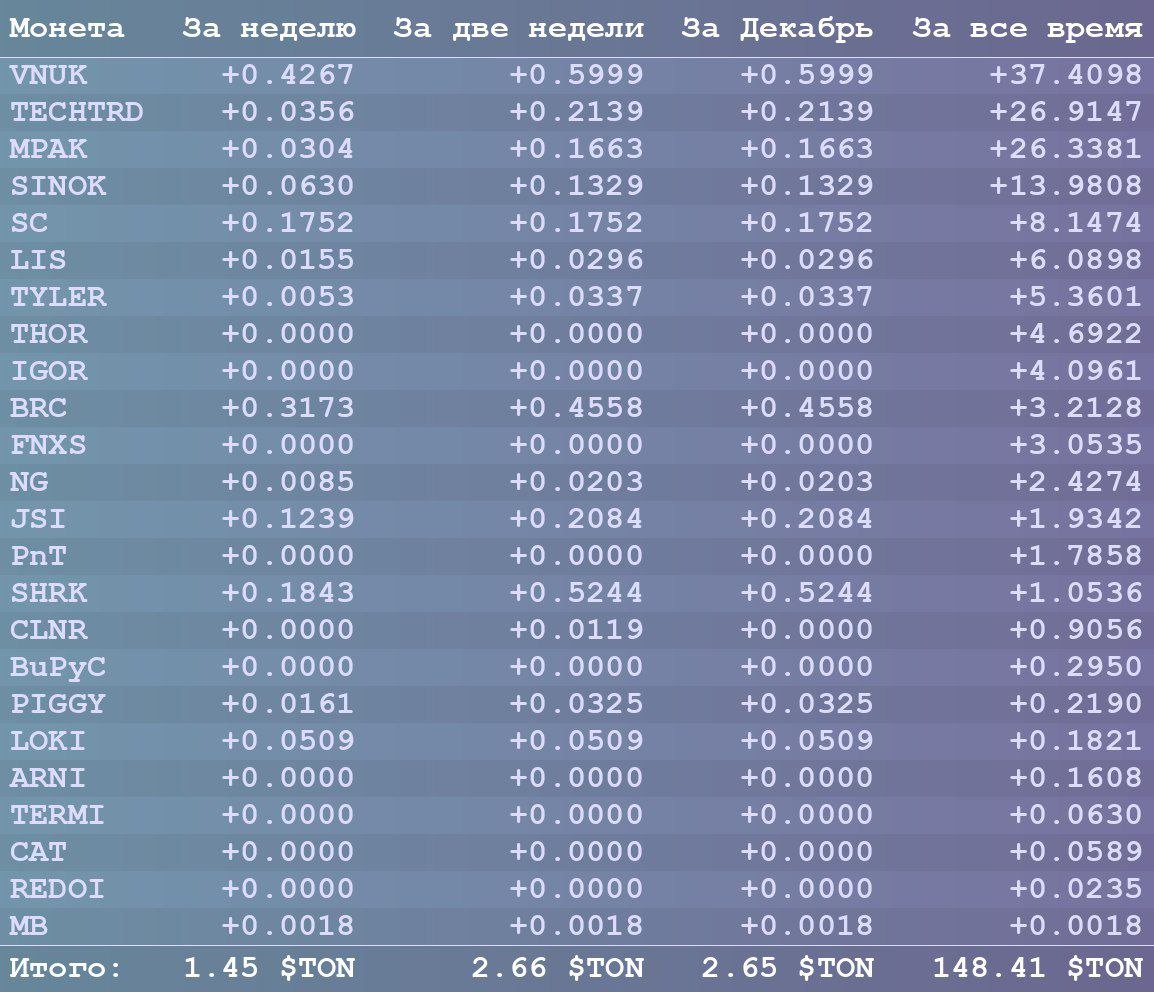 🤑 Привет Ричмэны. У нас сначала декабря, как то не густо вышло по фонду и дивидендам. Ничего наращиваем позицию, докупаю токены в фонд. Отчёт по дивам видите сами. Плюс к этой сумме добавляется 1.1 тон авторских с перепродажи нфт. Плюс была фиксация по техно В итоге будет выплачена сумма в 12 тон. Остальное пойдет на увеличение фонда. Работаем дальше. И не забываем до конца года есть акция 3 по цене 2-х Покупайте выгодно. Всех обнял приподнял, Рич Не является индивидуальной инвестиционной рекомендацией. | КАНАЛ | ЧАТ | Rikki Rich | RICH on TON | САЙТ | ROADMAP | ---------------------VNUK---------------------- | Канал | Чат | Sticker | Dedust | График | САЙТ | ROADMAP | наш бот | DYOR | mr.Vnukich |