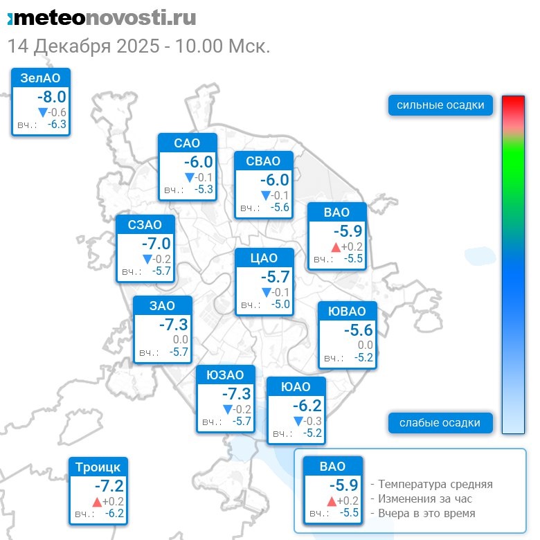 В 10:00 в Москве было от -8.2°C до -5.2°C, средняя температура -6.4°C #погода #Москва #зима #температура #14декабря #воскресенье