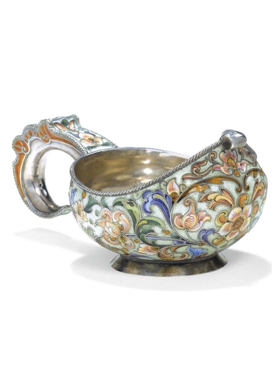 Воскресная рубрика Картинная галерея Имя Фёдора Рюкерта в последние десятилетия стало появляться в музейных атрибуциях всё чаще, а его работы стабильно привлекают внимание коллекционеров. Прусский подданный, работавший в Москве с 1880-х годов, Рюкерт создал мастерскую, чьи изделия охотно заказывали фирмы Павла Овчинникова, Ореста Курлюкова и Карла Фаберже. Его мастерская располагалась на Таганке, в Рогожской слободе, неподалёку от других ювелирных фабрик. В 1890-е в ней трудилось всего несколько человек, но уже тогда Рюкерт производил ковши, чаши и кубки, которые позже стали узнаваемыми по характерной технике. Рюкерт работал с плотными переходами цвета, использовал полихромные тени и создавал орнаменты из изогнутых стеблей и крупных листьев. Открытого металла на его предметах почти не оставалось, поэтому поверхность выглядела как цельная живописная плоскость. Также в декоре активно встречались фольклорные персонажи. К началу XX века мастерская разрослась, а всё большую роль в творч