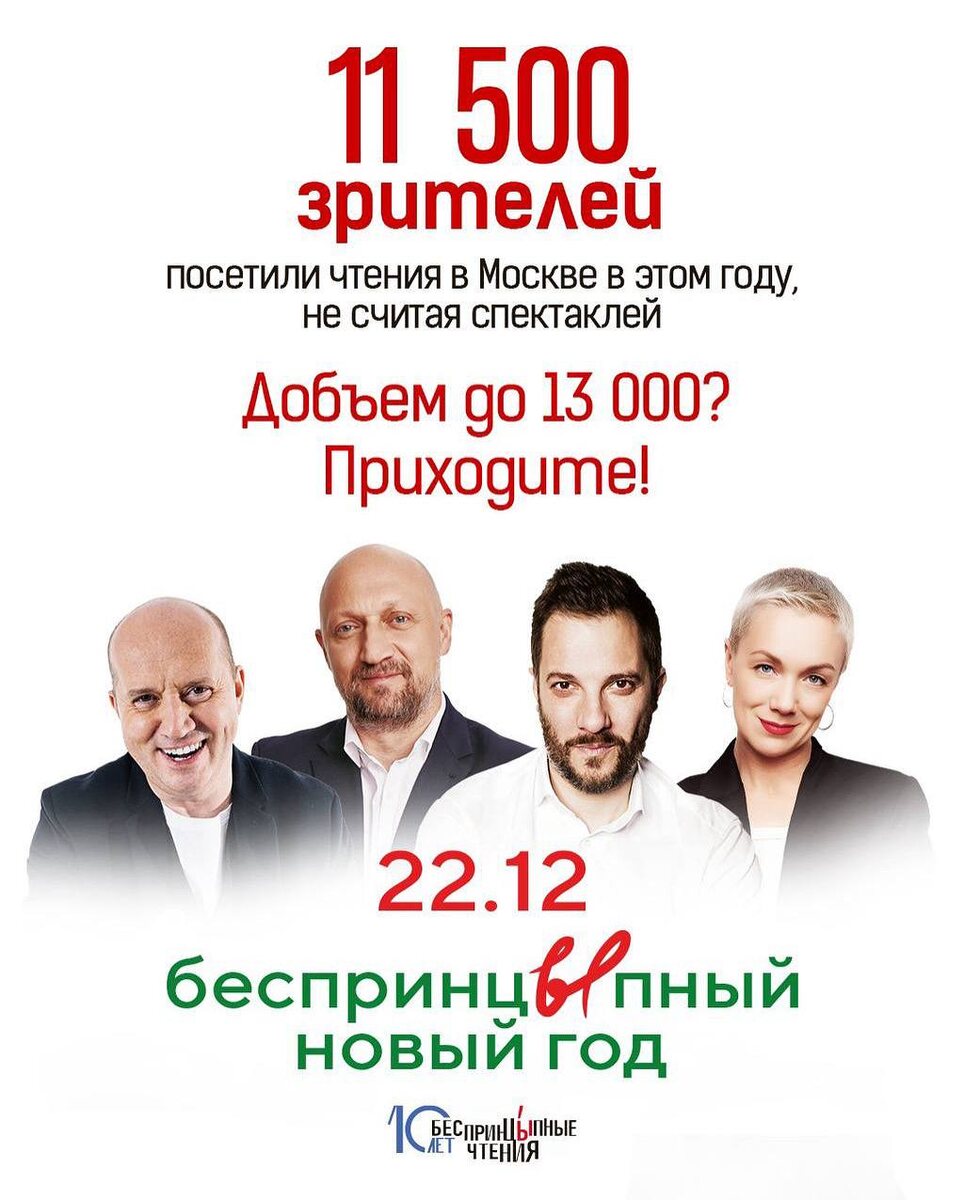 11 500 зрителей мы уже собрали на чтения в Москве за год. Это без учета десятков спектаклей по пьесам. Надо дотянуть до 13 000, а для этого приходите в театр Мюзикл. 4 человека там точно будут. Я, Гоша Куценко, Сергей Бурунов и Даша Мороз.