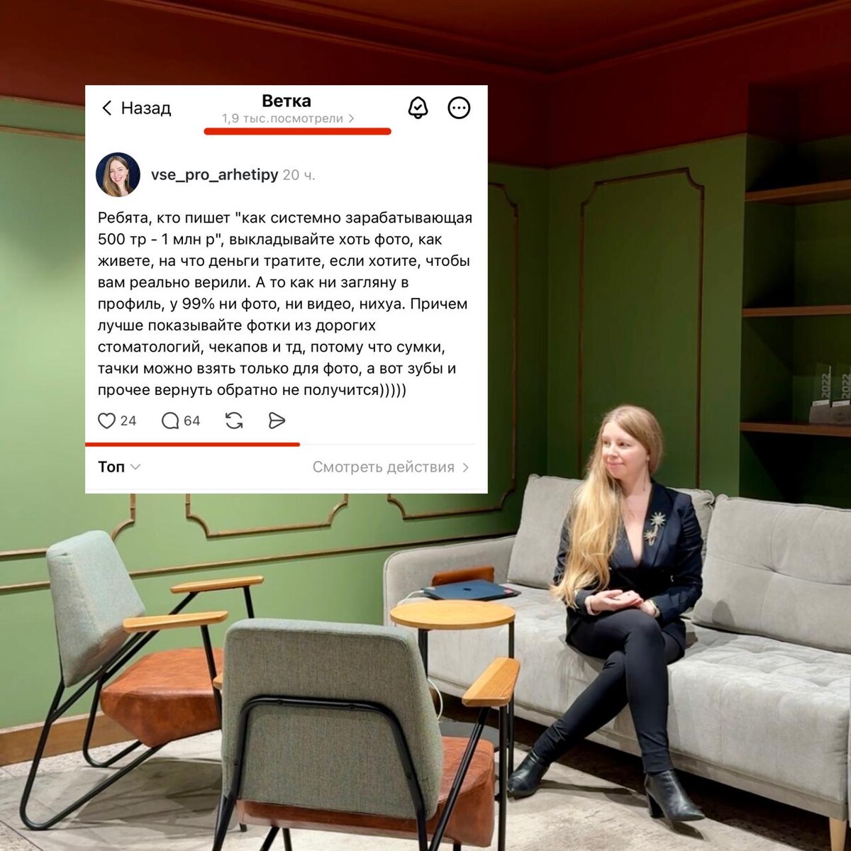 500 000 руб - 1 000 000 руб в месяц — это уровень базы. Или нет? Вчера мой тредс про то, что если продаете через «как системно зарабатывающий 500 тыс - 1 млн руб» , то показывайте уровень жизни, на что тратите деньги, набрал 1900 просмотров и 64 комментария, правда с моими ответами, но все же) Пришли десятки людей с таким доходом и сказали, что «а что показывать, это база, просто комфортная жизнь». Пришли люди с доходом 1-2-3 млн руб, и тоже включились в дискуссию. И знаете о чем это говорит? 1️⃣Ваши смыслы определяют то, какие люди к вам приходят. Если вам кажется, что у людей денег нет, что у всех доход 50-100 тыс, то это не так. Просто какие смыслы транслируете, такие люди и приходят. Это всегда разбираю с клиентами, как на уровне блога, текстов, презентаций, чтобы привлекать тех, кто нужен. 2️⃣Искать нужную аудиторию стоит там, где она есть. С этим так же всегда помогаю клиентам, потому что частенько поиск клиентов у людей выглядит как рыбалка из Ералаша: - Здесь рыбы нет! -