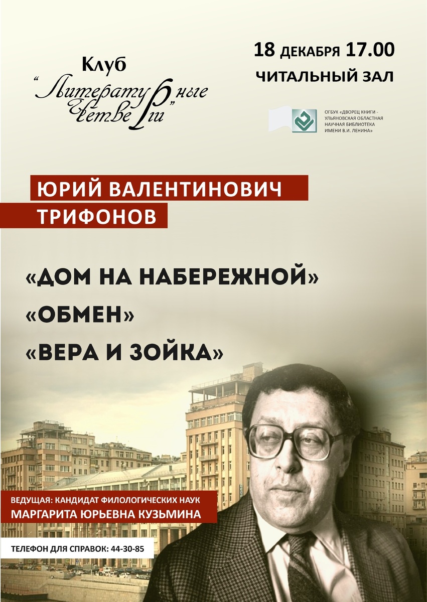 »! 📚 В этот раз в центре нашего внимания – творчество одного из крупнейших писателей 1960-1970-х годов Юрия Трифонова. Темой обсуждения станут его произведения «Дом на набережной», «Обмен» и «Вера и Зойка». ✏️ Юрий Валентинович является одним из первооткрывателей и признанных мастеров «городской прозы». Столица в его произведениях – не просто фон, а полноценный персонаж, определяющий судьбы героев. 📍 Подробнее - на нашем сайте: https://clck.ru/3Qprcb ✏️ Принять участие в дискуссии могут все желающие. Заседание пройдёт под руководством кандидата филологических наук Маргариты Юрьевны Кузьминой. 📍 Вход свободный! Телефон для справок: 8(8422)44-30-85 – Читальный зал Дворца книги. Больше о событиях Дворца книги можно узнать на портале Культура.РФ #ДворецКниги_афиша