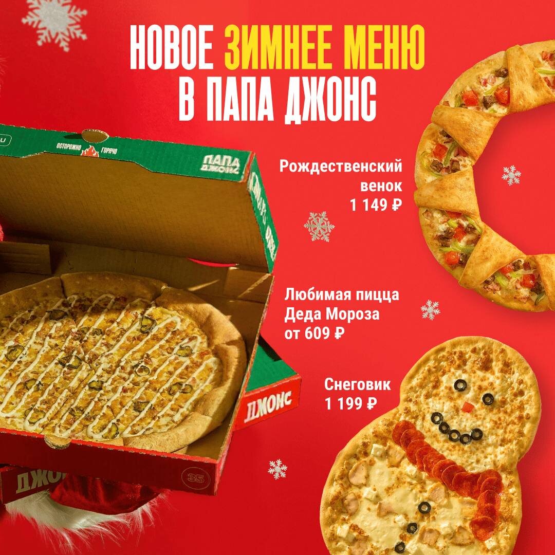 Зима официально вступила в чат А мы — в печь 👀🔥 В Папа Джонс вышло новое зимнее меню, и оно такое, что: ❄️ снеговики тают ❄️ венки становятся съедобными ❄️ Дед Мороз делится любимой пиццей (да, мы проверили) Что согревает этой зимой: ☃️ Пицца «Снеговик» — 1 199 ₽ Симпатичный снаружи, очень серьёзный внутри 😌 🎄 Рождественский венок — 1 149 ₽ Украшение стола, которое не доживёт до вечера 🎁 Любимая пицца Деда Мороза — от 609 ₽ Потому что даже волшебникам нужен сырный перерыв Все пиццы — с фирменным тестом, сочной начинкой и тем самым «ммм» с первого кусочка 👉 Заказывай прямо сейчас Папа Джонс — зима вкуснее, когда она с сыром ❤️🍕