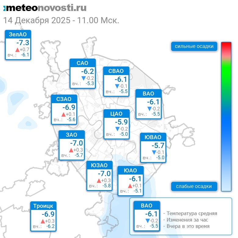 В 11:00 в Москве было от -7.5°C до -5.4°C, средняя температура -6.3°C #погода #Москва #зима #температура #14декабря #воскресенье Перейти на сайт Прогноз погоды на 14 дней