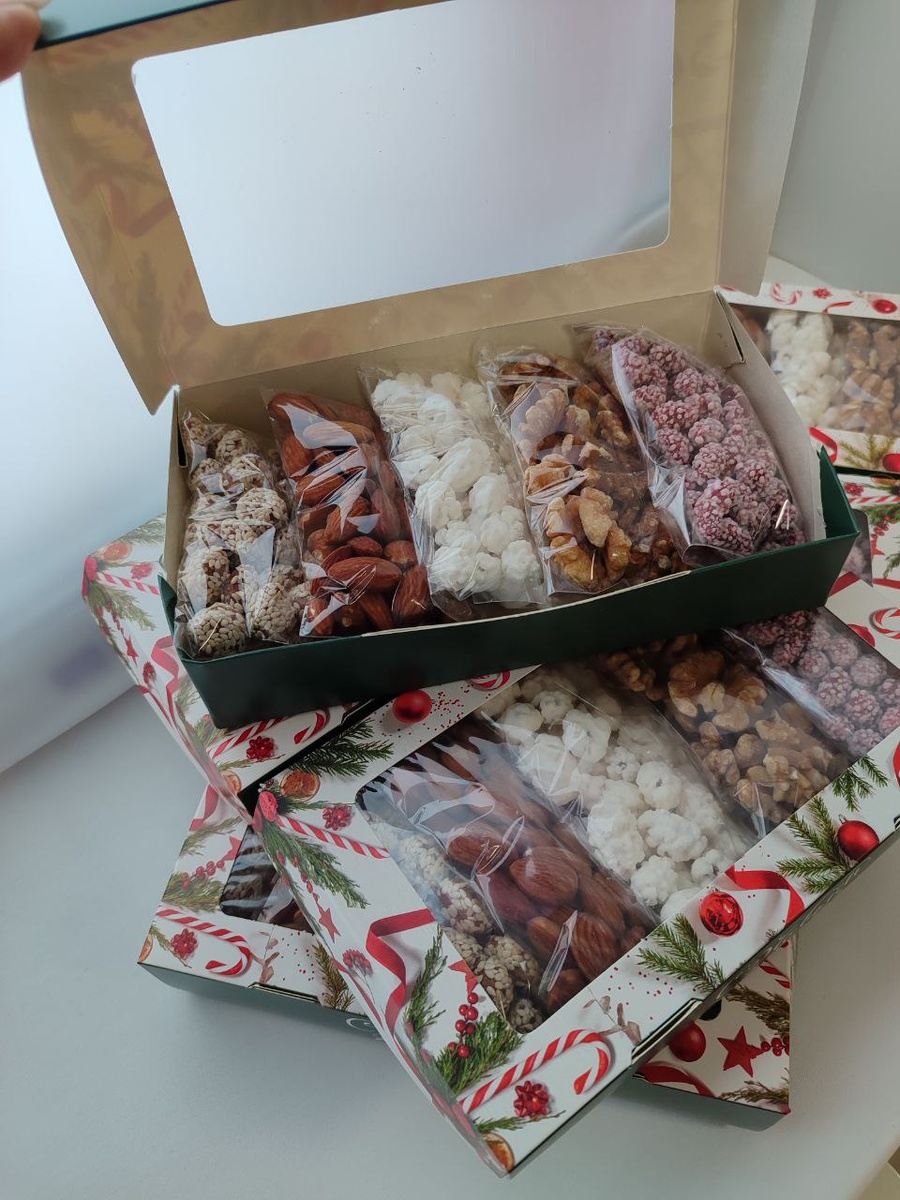 Мини коробочки с ассорти из орехов. Коробка 21*12 см Арахис в кунжуте, миндаль, арахис в сахаре, грецкий орех, арахис в сахаре "Ёжики". Стоимость набора 800р.