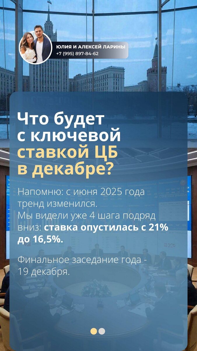 Что будет с ключевой ставкой ЦБ в декабре? Напомню: с 6 июня 2025 года началось то, чего многие ждали три года — ЦБ впервые пошёл на снижение ключевой ставки. С тех пор — уже 4 шага подряд вниз: с 21% до 16,5%. Последнее в этом году заседание ЦБ по ставке - 19 декабря. Большинство аналитиков рынка прогнозируют очередное снижение ключевой ставки на 0,5 п.п., до 16%. Снижение возможно, благодаря замедлению инфляции: - в ноябре годовой показатель снизился до 6,64% по сравнению с 7,71% в ноябре, а месячный - до 0,42% после 0,50% в октябре. - темпы роста цен оказались ниже прогнозов регулятора. Я тоже думаю, что ЦБ будет осторожен и пойдет на небольшой шаг вниз - на 0,5 п.п. А как вы считаете?