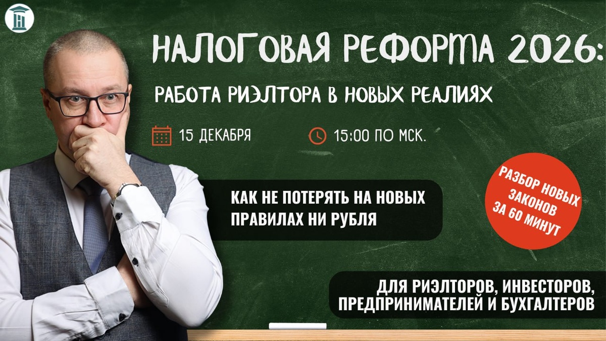 🔥 Вебинар уже ЗАВТРА! С 2026 года запускается масштабная налоговая реформа: переписывают правила по срокам владения, наследству, дарению, коммерции и режимам для ИП. Риэлтор, который не знает этих норм, просто не сможет безопасно вести сделки и будет терять клиентов. 🪧 Уже завтра 🕒 15:00 (мск) 🔗 Регистрация: https://barancha.ru/reform26 📝 Стоимость участия — по ссылке Онлайн-вебинар Вадима Баранча «Налоговая реформа 2026: работа риэлтора в новых реалиях» Разберём: ✅ новые сроки владения и когда НДФЛ всё равно возникает; ✅ когда наследство и дарение больше не дают освобождения; ✅ изменения 382-ФЗ и «пятое условие»; ✅ новые лимиты УСН, патента и АУСН для риэлторов; ✅ как безопасно продавать «коммерцию» в 2026 году. ⚠️ Это база, без которой в новых реалиях работать рискованно — и для вас, и для клиента. 👉 Успейте зарегистрироваться сейчас.
