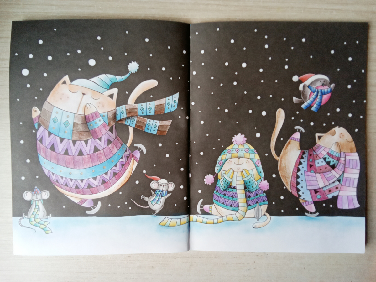 Сделала иллюстрацию со снегом в раскраске "Миллион новогодних котов". Она была раскрашена в недавнем видео. Вот такие коты и мышата на катке.