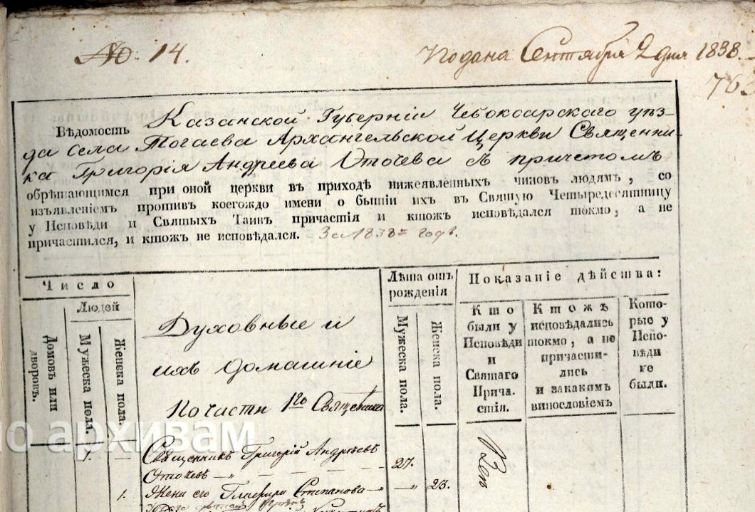 ГИА Чувашской Республики (ГИА ЧР), фонд № 225, опись № 7, дело № 59, стр. 763 скан. Подана сентября 2-го дня 1838 года. Ведомость Казанской Губернии Чебоксарского уезда села Тогаева Архангельской церкви священника Григория Андреева Оточева с причтом обретающимся при оной церкви в приходе нижеявленных чинов людям, со изъявлением против коегождо имени о бытии их в Святую Четыредесятницу у Исповеди и Святых Таин причастия и кто ж исповедался токмо, а не причастился, и кто ж не исповедался. За 1838 год. Духовные и их домашние по части 1-го священника. № 1. Дьячек Михаил Андреев Тогаев. 29 лет. Жена его Екатерина Семенова. 25. У них дети: Николай. 1. Марья. 4. https://yandex.ru/archive/catalog/790bfee3-0e0e-4511-8798-cecc800794b6/763