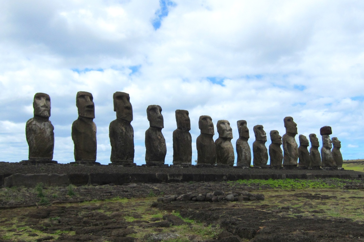 Подошли к семи огромным фигурам на платформе Аху Акиви (Ahu Akivi). Здесь семь моаи уникально смотрят в сторону океана, в отличие от большинства статуй на острове, ориентированных внутрь суши. Комплекс построен около 1500 года. По данным исследований Тура Хейердала в 1960-х годах, он служил обсерваторией: моаи выровнены по закату солнца во время весеннего равноденствия. Местные легенды связывают статуи с семью мореплавателями, отправленными первым королём Хота Матуа на поиски новой земли.