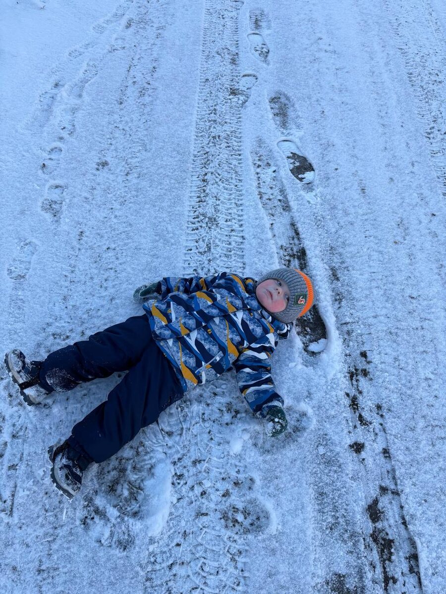Арсеня решил взять по максимуму от снега и лечь прям на дороге