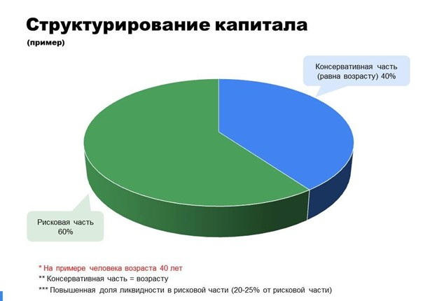 Я расскажу, как построить портфель, который выдержит любые бури — от инфляции до глобального апокалипсиса (ну, почти). Почему диверсификация — это не прихоть, а суперсила? С возрастом мы все осторожнее. В 20 лет вы можете кидать все деньги в крипту или стартапы — адреналин, рост, "я бессмертный!". Но к 35 годам (или позже) вместе с ростом стоимости портфеля толерантность к риску падает. Поэтому правило номер один: пересматривайте портфель регулярно. Консервативная часть (те самые "спокойные" активы) должна равняться вашему возрасту. Для 35-летнего — 35% в консервативах, 65% в рисковых. Рисковая часть (65%): Акции, фонды на акции и немного кэша. Консервативная часть (35%): Облигации, золото или фонды на него. Важный лайфхак: даже в рисковой части держите "подушку" ликвидности (кэш или эквиваленты). Не меньше 20% от неё! Почему? Чтобы в кризис можно было докупить ещё акций. Разбираем рисковую часть: Я предлагаю разделить её на три группы, привязав к секторам экономики. Есть компании,