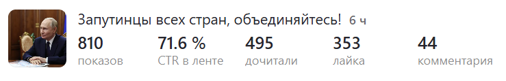 Новый способ управления общественным мнением. Просто не показывать. Все, кто её прочитал это практически самая активная часть читателей, которые сами отслеживают выход новой статьи. 0хота на ведьм продолжается. Средние века в новой обложке. Не в курсе, а почему ведьмы никогда не спасали сами себя? А покорно топились, сжигались, пытались и самоиздевались? Чего именно боялось мужское религиозное сообщество, что так рьяно уничтожало качественный генофонд? Или это происки недоброжелательниц, которые не могли похвастать красотой ни тела , ни души и строчили доносы, не покладая рук и не жалея мозолей. По мне именно так себя сейчас ведёт и вся евроверхушка. Им нечего противопоставить нам, а значит надо нас опорочить. И в этой своей одержимости они достигли такого совершенства, что тёмные силы взмолились спасти их. Где-то в Европе в эти самые минуты 3еленский потирает потные ладошки, делает умное лицо и репетирует очередную речь. Суфлёры в виде ес-совских воротил держат в руках шпаргалки