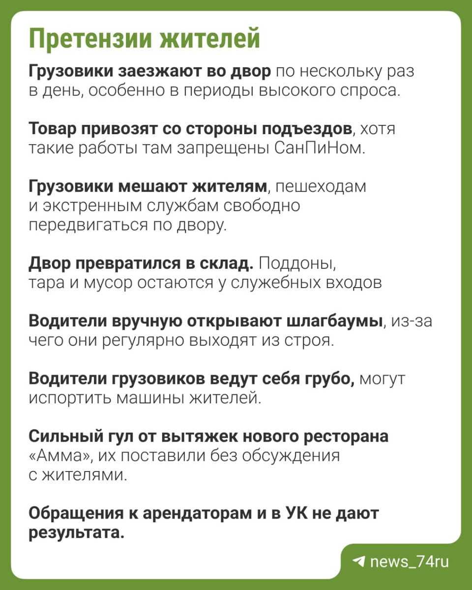 «Курьер плюнул мне на машину!» Жильцы дома с «Золотым яблоком» объявили войну грузовикам в разгар предновогоднего шоппинга Жители многоэтажки на Сони Кривой, 26 в Челябинске хотят запретить въезд грузового транспорта к себе во двор. Много лет они терпели соседство с «Золотым яблоком». Но перед этим Новым годом оборот парфюмерного супермаркета по их ощущениям вырос настолько, что грузовики с товаром идут просто в режиме нон-стоп. А еще есть доставка онлайн-заказов, за которыми тоже приезжают на машинах. До абсолютной точки кипения людей довело недавнее открытие ресторана «Амма». Кроме грузовиков с продуктами, жильцы недовольны мощными вытяжками. Звук от них жильцы ближайшего подъезда сравнивают с гулом самолетов, от которого не спасают даже закрытые окна. 🟥Конфликты. Двор на Сони Кривой считается закрытым. Въезды со стороны Красной и Васенко оборудованы шлагбаумами, а доступ — только у жителей. По словам местных, водители большегрузов поднимают шлагбаум руками — от этого он уже не р
