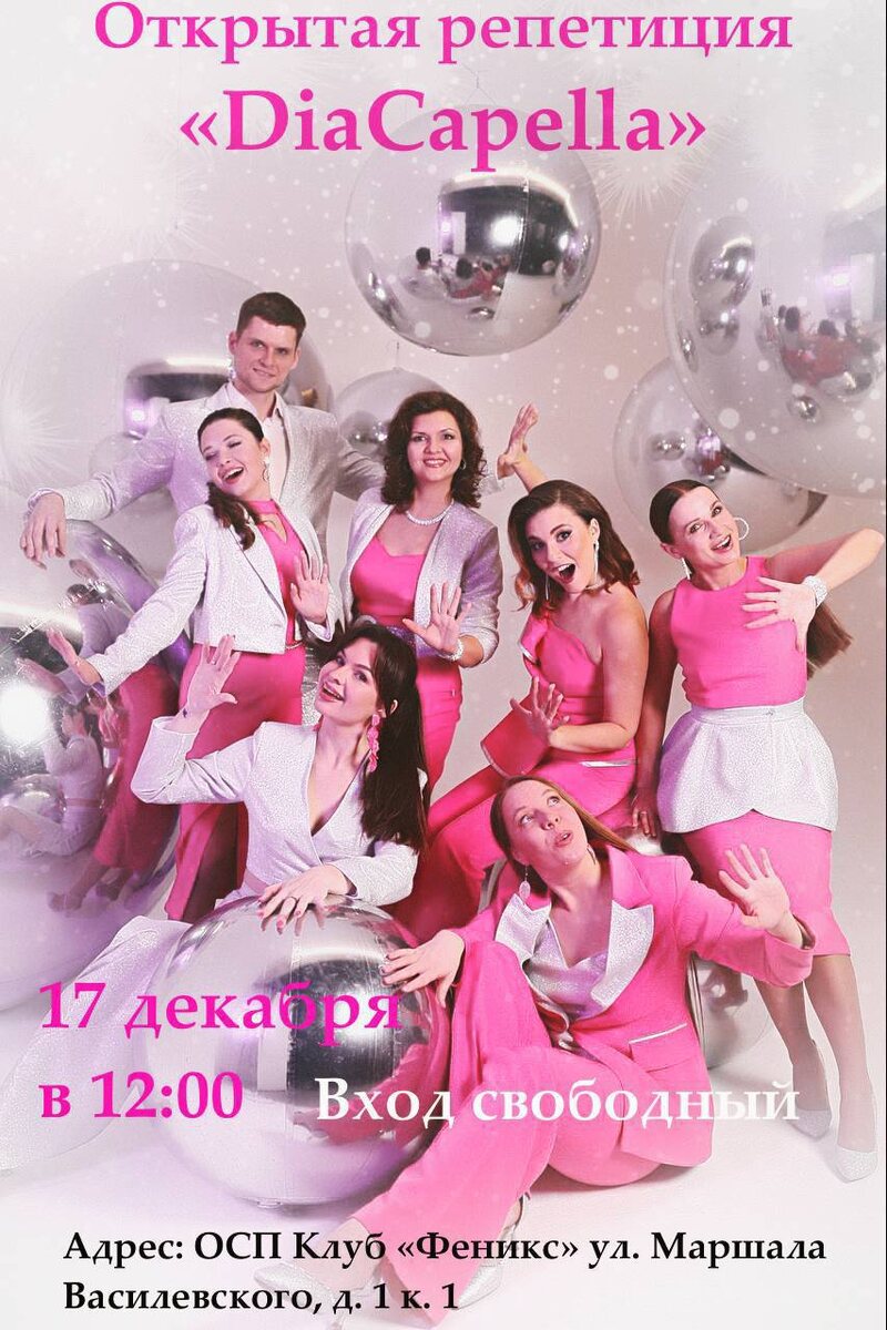 💫 Приглашаем на открытую репетицию вокального ансамбля «DiaCapella» ⛄️ ❄️ 17 декабря в ОСП Клубе «Феникс» — яркое шоу от DiaCapella Уникальное сочетание акапельных голосов и битбокса 🎶 В программе: ✨ мировые новогодние хиты ✨ классика в современном звучании ✨ саундтреки из любимых новогодних фильмов 🎤 диапазон звучаний — от глубокого баса до колоратурного сопрано 🥁 вместо ударных — двукратный чемпион России по битбоксу 🌟 О коллективе: победители проекта «Битва хоров», участники шоу «Голос», «Ну-ка, все вместе, хором», «Звезда» частые гости телеканалов Первый, Россия 1, НТВ, Звезда сотрудничают с Дмитрием Маликовым, Николаем Басковым, Максимом Дунаевским, озвучивают ледовые шоу Евгения Плющенко 🏆 В 2021 году DiaCapella полностью голосами и битбоксом озвучили фильм-балет под водой «Спящая красавица» — 🎬 шорт-лист «Оскара» 🎼 премия Андрея Петрова за лучшую музыку к фильму 📍 Где: Москва, ул. Маршала Василевского, д. 1, к. 1 (вход со стороны вывески «Восток») 🗓 Когда: 17 декаб