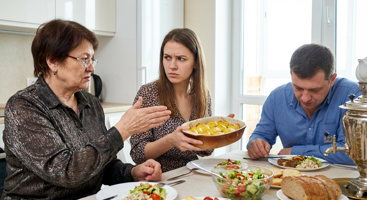 Свекровь, сидящая во главе стола как королева-мать, отложила вилку и с укоризной посмотрела на невестку поверх очков. На ней была праздничная блузка с люрексом, которая почему-то придавала ей вид не нарядный, а воинственный.