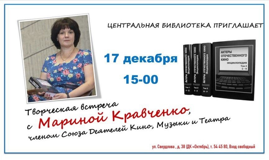 ✨ Творческая встреча с Мариной Кравченко Приглашаем на творческую встречу с Мариной Кравченко, членом Союза деятелей кино, музыки и театра. 🚫 Возраст: 12+ 📆 17.12.2025 🕒 15:00 🏢 Центральная библиотека 📍 г. Подольск, ул. Свердлова, д. 38 💰 Вход свободный❗️ ⭐Поддержать канал голосом 🍰Где поесть в Подольске ✅ Мероприятия Подольск https://dzen.ru/id/66ed500f7b5671493eca3fd6 http://vk.com/podolsk_events http://dzen.ru/podolsk_events