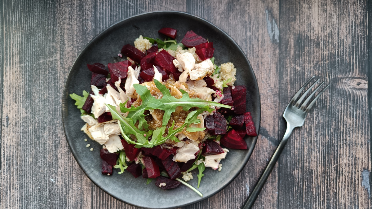 Итак, салат с киноа, курицей, свёклой, руколой и медовой заправкой:
