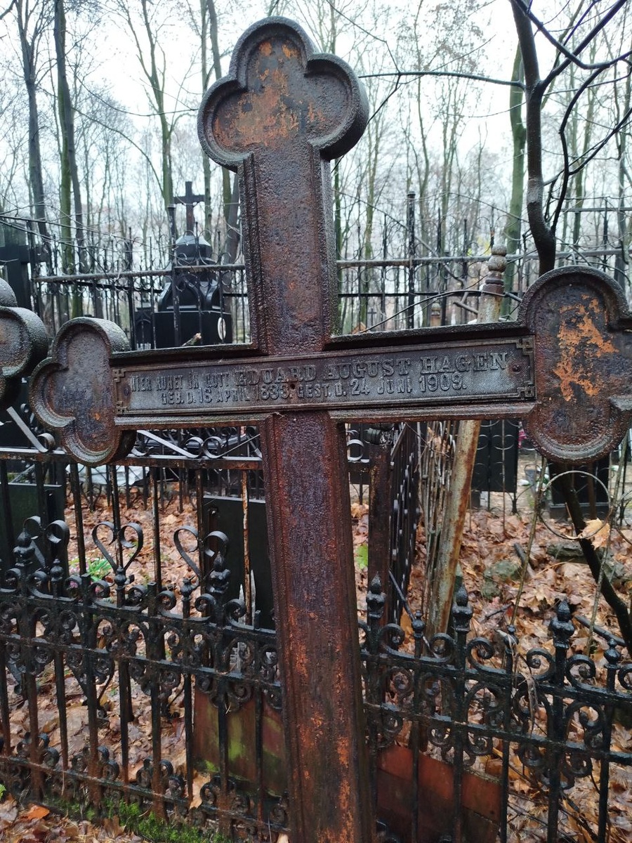 Находка на Введенском или "не просто частное захоронение" Когда я попадаю на Введенское кладбище, стараюсь выделить время и пройтись. Иногда ищу какое-то конкретное захоронение, иногда просто гуляю и рассматриваю надгробия. Обычно во время таких неспешных прогулок обязательно находится что-то, за что "цепляется глаз". Тут зацепилась за фамилию на поржавевшем чугунном кресте - Hagen... В памяти тут же всплыла скороговорка, которую учат, наверное, все студенты-германисты: Herr von Hagen, Darf ich's wagen Sie zu fragen - Welchen Kragen Sie getragen, Als Sie lagen Krank am Magen Im Spital zu Kopenhagen? На кресте надпись, гласящая, что здесь покоится Эдуард Август Хаген, родился 16 апреля 1833, скончался 24 июня 1909. Сколько таких могил на кладбищах, о которых мы обычно говорим "это просто частное захоронение", подразумевая, что мы об этом человеке ничегошеньки не знаем. Просто жил. Просто умер. Кем был, как жил - непонятно... Но так меня этот Хаген зацепил, что я решила наудачу его
