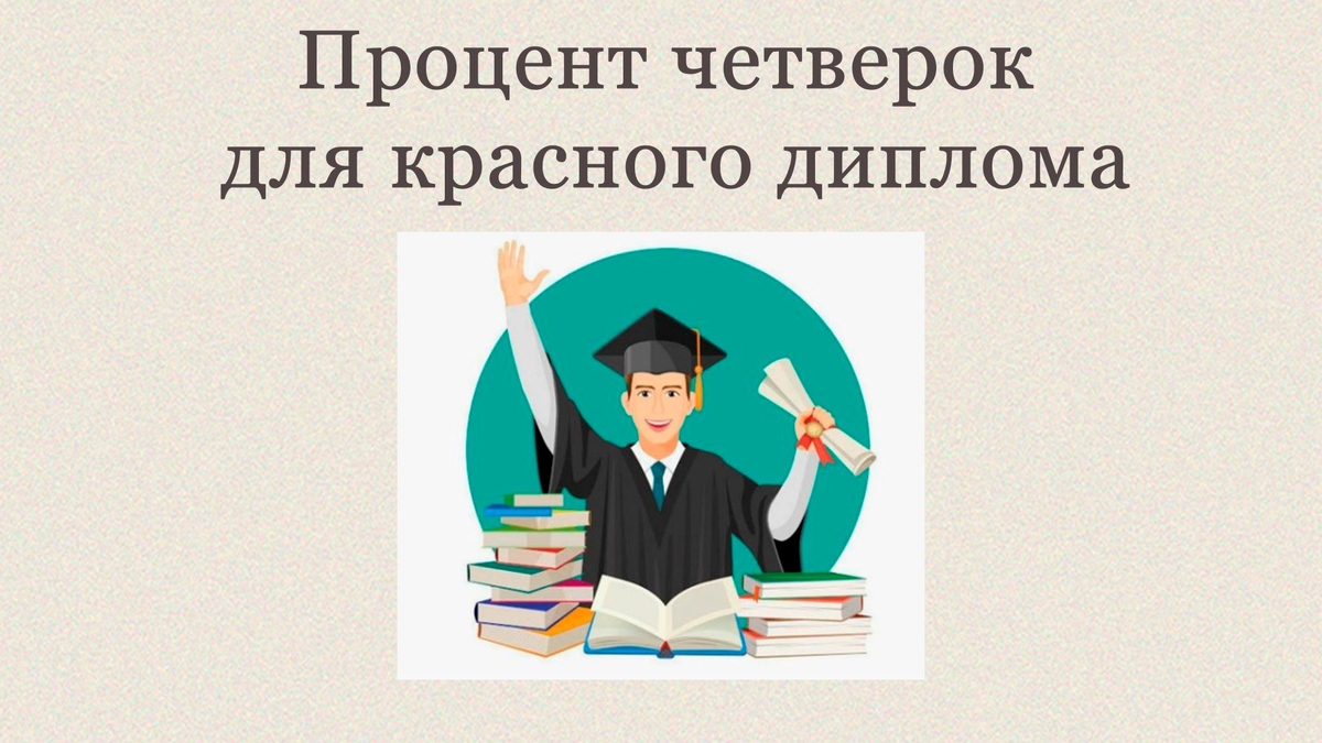 Не более 25% от общего числа оценок в приложении к диплому — допустимое количество четвёрок для получения красного диплома (диплома с отличием). Учитываются не только экзамены, но и дифференцированные зачёты, производственная практика и курсовые работы. Оценки типа «зачтено» при расчёте не учитываются.