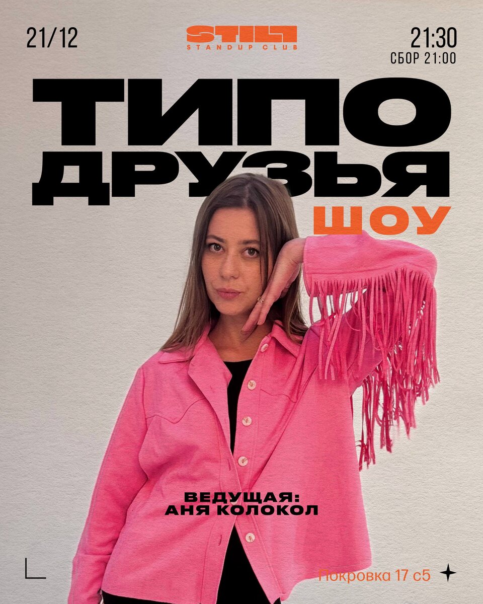 В воскресенье приходите. Будет смешно, уютно и сплетни)) Билеты тут: https://stillstandup.com/afisha/tpost/y9la0o4sb1-tipo-druzya-shou