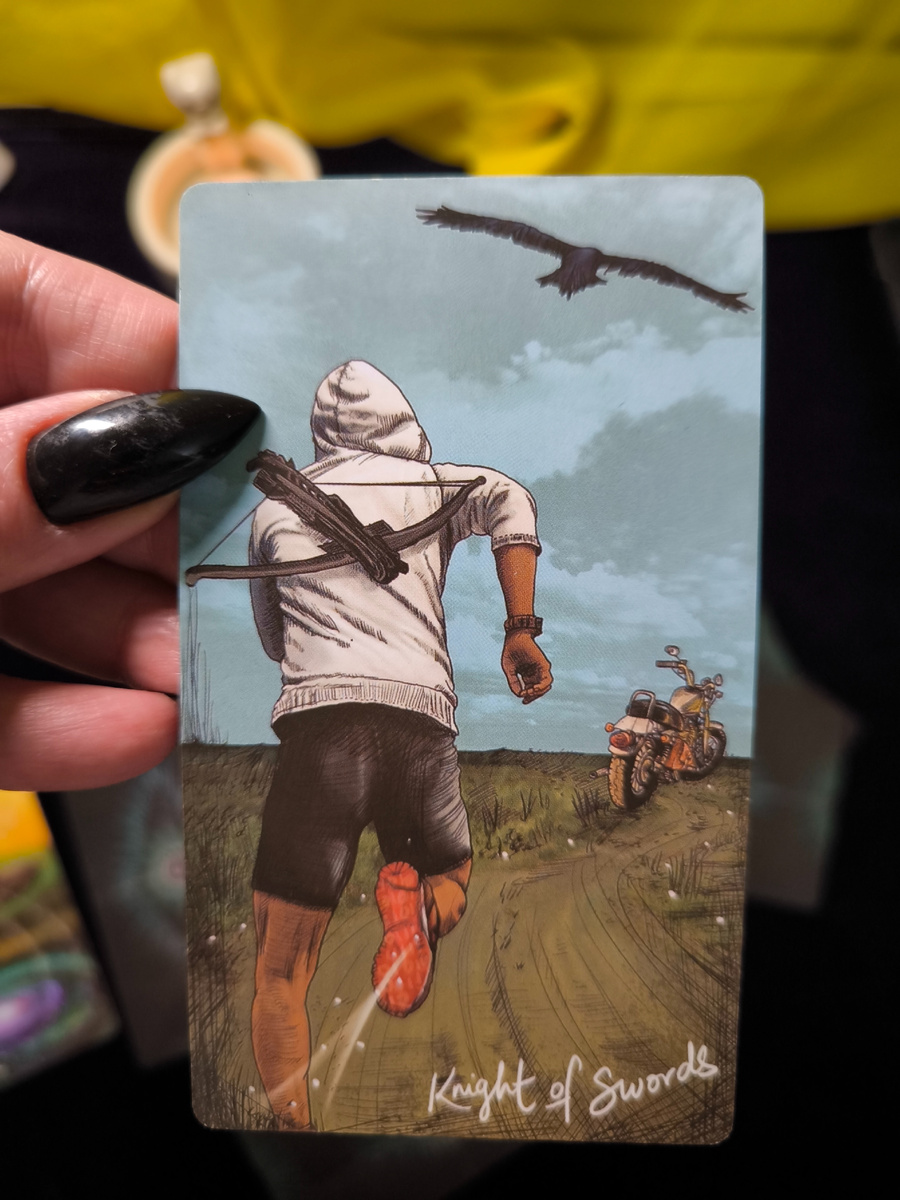 Сегодняшний день проходит под влиянием **Рыцаря Мечей**, аркана стремительного движения, резких решений и мощного интеллектуального импульса. Это карта скорости, внутреннего вызова и готовности ворваться в события, не оглядываясь назад. Приветствую вас на моем канале "Отливки воском. Руны. Таро"! Меня зовут Татьяна, я практикующий маг с 20-летним опытом. В своей практике я использую отливки воском, руны, таро. Провожу диагностики и чистки, снятие наведенного и родового негатива, крадников и приворотов. Использую светлую магию, работаю с богами Северной Традиции, веду обучение рунами и отливкам воском. На этом канале я делюсь своим опытом магической работы, своими магическими знаниями, а также интересными случаями из своей практики. Присоединяйтесь ко мне в увлекательном путешествии по загадочному миру мистики и магии! По дороге бежит молодой мужчина в белой спортивной куртке с капюшоном. За его плечами арбалет, а впереди мчится мотоцикл, который уже начал движение без седока. Рыцар