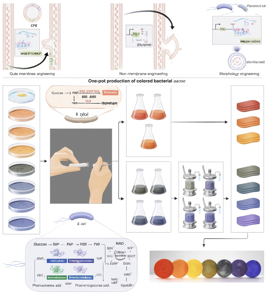 Бактерии — это не только источник инфекций, но и производители разнообразных веществ, полезных для здоровья человека и применимых в быту. Один из таких примеров — бактериальная целлюлоза: микробные волокна, которые могут стать экологичной альтернативой синтетическим материалам на основе нефти, таким как полиэстер и нейлон. Принципиально важно, что бактерии способны не только синтезировать волокна, но и окрашивать их. Микробные красители относятся к двум основным молекулярным семействам: виолацеинам (их оттенки варьируют от зелёного до фиолетового) и каротиноидам (от жёлтого до красного). Однако здесь возникает технологическая проблема: волокна и пигменты продуцируются разными видами бактерий, которые при совместном культивировании подавляют рост друг друга. Корейским учёным удалось обойти это ограничение. Они применили поэтапный подход: либо добавляли пигмент-продуцирующие бактерии после начала роста целлюлозообразующих микроорганизмов, либо замачивали уже сформированную бактериальную