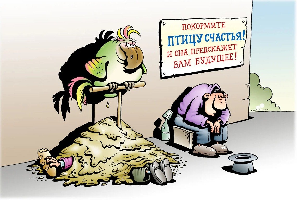 Мой дед, когда его спрашивали про счастье, отвечал коротко: «Когда ничего не болит». В юности мне это казалось ответом уставшего человека. Сейчас понимаю, что это была концентрированная мудрость, добытая опытным путём. Счастье — тема скользкая. Все о нём говорят, все его хотят, все точно знают, что его нет у соседа. При этом у соседа новая машина, а выглядит он как-то кисло. Значит, не в машине дело. Философы пишут тома, психологи проводят исследования, коучи продают вебинары, а человек на вопрос «ты счастлив?» по-прежнему чешет затылок и отвечает что-то вроде «ну... в целом... наверное». И это, пожалуй, самый честный ответ из возможных. Карикатуристы всегда относились к теме счастья с профессиональным интересом и лёгким подозрением. Не потому что злые или циничные. А потому что карикатура — это взгляд сбоку, из-за угла, снизу. Это подмечание того, что люди стараются не замечать. А в теме счастья таких слепых пятен особенно много. Мы все эксперты по чужому счастью и полные профаны в св