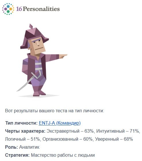 Тест назвал меня "Командиром", неужели он прав? 🤔 Друзья, привет! Как ваш декабрь? Тоже как и всегда напряжённый? Я вот пытаюсь всё успеть, в том числе в выходные закрываю долги по учёбе. Кстати, об учёбе: там дали задание — пройти тест на тип личности. Ожиданий не было, но потратил 10 минут, прошёл тест. Результат — ENTJ-A (Командир). Описание: "Редкий, но энергичный тип с сильной склонностью к логике и творчеству. Использует целеустремлённость и острый ум для достижения целей. Но ему недостаточно просто достичь — его ум ищет, как сделать это быстрее, лучше и надёжнее". Сначала не воспринял. Но потом оглянулся на последние годы: — мой путь от кода в более масштабные инициативы, в управление; — постоянный поиск "рычагов" и системных решений; — бесконечный внутренний вопрос "а как сделать лучше и эффективнее?", который двигает меня вперёд. Сделал интересный вывод: я не стал этим человеком вчера, эти черты во мне уже были — просто раньше я не обращал на них внимания, не считал их с