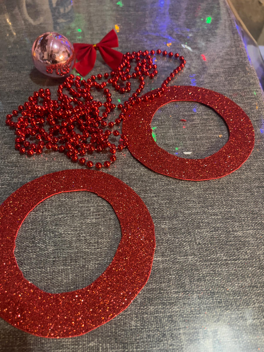 Итак… добро пожаловать в клуб «очумелые ручки». Часть 2 😁 В этот раз заданием от воспитателей было принести ёлочную игрушку, сделанную своими руками. А так как у меня теперь два малыша ходят в сад, то и поделок должно быть, соответственно, две. Вызов приняла и пошла вдохновляться в безграничный интернет, ибо моей фантазии категорически не хватает. Решила сделать разные поделки. Нашла подходящие варианты, докупила необходимый материал и два вечера подряд творила волшебство 😁 Для первой поделки нам понадобится: блестящий фоамиран (у меня красный), небольшой ёлочный шарик, бусы для ёлки, бантик, клей-пистолет и железные нервы. Для начала из фоамирана вырезаем два одинаковых кружочка, из середины каждого — круг меньшего диаметра. Циркуль у нас сломан, так что пришлось делать шаблоны из подручных средств. У меня это детская тарелка и кружка 😅 На первый круг клеим ёлочный шарик так, чтобы он свободно свисал посередине, и приклеиваем второй круг к первому с обратной стороны. (Боже,