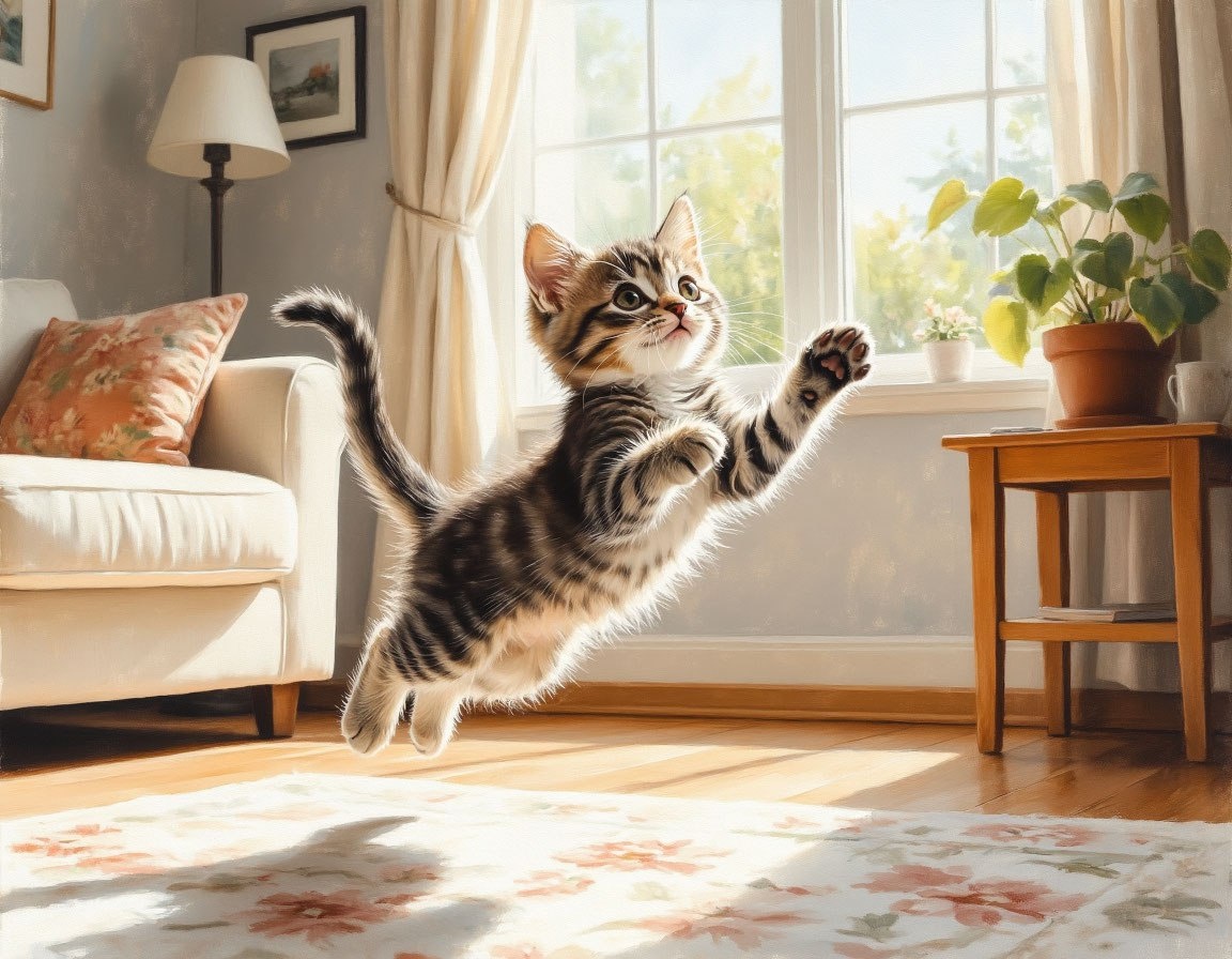 В доме зимой с поломанным котлом холодно, всюду стужа, но вот котёнок резвится и играет на полу, весела скакая и прыгая, всем своим видом