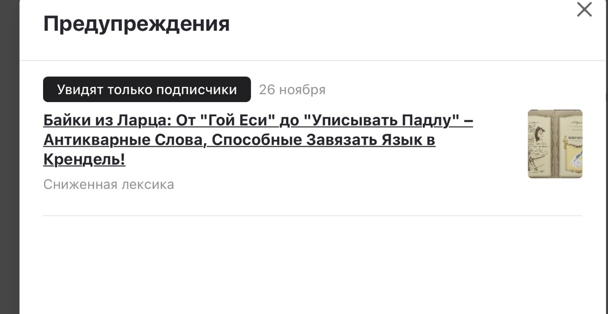 Ну что, друзья, дожили! Кажется, моя скромная персона, подвизающаяся на ниве антикварного блогерства, попала под бдительное око цензоров "Дзена". Да-да, та самая я, которая выискивает пыльные раритеты и рассказывает вам сказки из бабушкиного сундука. Но, видимо, истории оказались чересчур… фольклорными. Вы не поверите, но мою статью под названием "Байки из ларца…" (название, кстати, как у передачи, которую, видимо, тоже скоро запретят) заблокировали! Причина? Внимание, барабанная дробь… "сниженная лексика"! Байки из ларца "Сниженная лексика", Карл! У меня сразу всплыли ассоциации с "Приорой" на пневме, но, оказалось, все гораздо серьезнее. Видимо, мои попытки воскресить старинные русские словечки, которые мы уже и позабыли (ну, там, всякие "окоемы", "зеницы"…), были расценены как подрыв устоев морали и оскорбление чувств великого и могучего современного языка. Я вот сижу и думаю: что я нарушила? Неужели тот факт, что я не придумала эти слова сама? Что они веками жили на страницах р