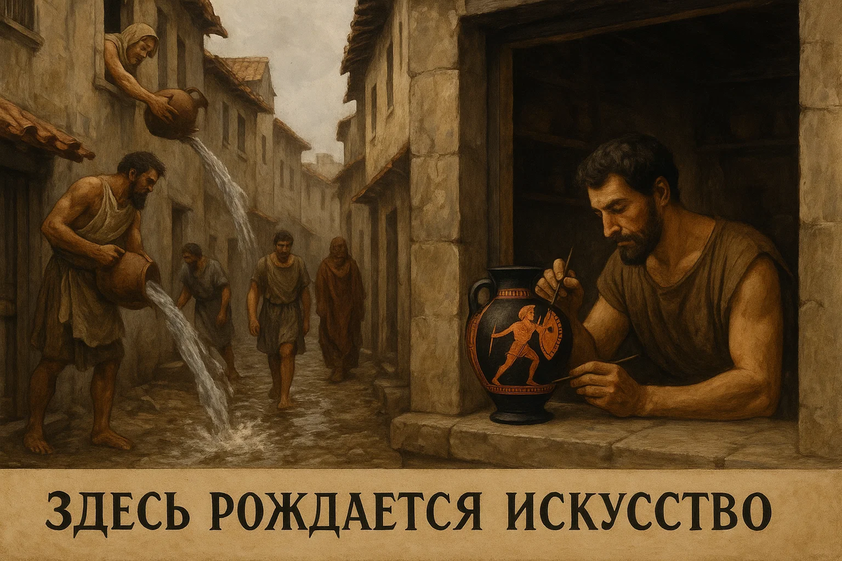 Но именно здесь делали знаменитые греческие вазы: Чёрнофигурные: Красная глина, черные фигурки (старый стиль). Краснофигурные: Черный фон, красные фигурки (новый стиль, более реалистичный). Грубую работу (месить глину) делали рабы, а роспись — свободные художники. Творчество не любит цепей! 🎨🏺 Агора: Сердце города Главная площадь — Агора. С утра здесь кипел рынок. Что продавали? Еду, одежду и даже рабов. Кто покупал? В основном мужчины. Женщины сидели дома. Если богач шел на рынок, рабы расчищали ему путь. Порядок: За порядком следила стража из рабов-скифов (да-да, полиция тоже была рабской!). Здесь же заседал Совет пятисот (правительство Афин). Дежурные члены совета даже спали тут в круглом здании, чтобы всегда быть на посту. 👮♂️🏛️ Акрополь: Дом богов Над городом возвышался Акрополь — святой холм. Храм Ники