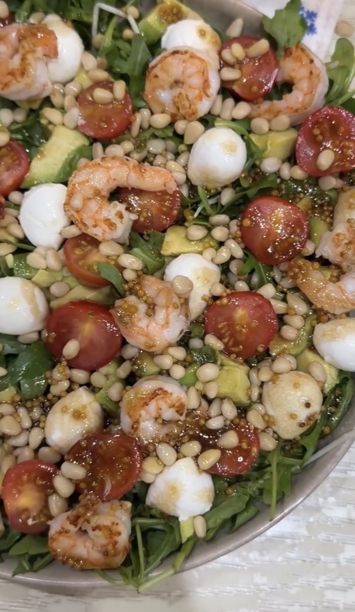 Нам понадобиться: Креветки королевские - 200-250 г Авокадо спелое - 1 шт. Руккола - 1 горсть (около 70 г) Помидоры черри - 10-12 шт. Моцарелла Кедровые орешки Для соуса: Оливковое масло - 2 ст. ложки Мед жидкий - 1 ч. ложка Горчица зернистая - 1 ч. ложка Соевый соус - 1 ст. ложка К приготовлению: 1. Креветки: Разогрейте на сковороде растительное масло. Обжарьте очищенные креветки с двух сторон до появления румяной корочки (2-3 минуты). 2. Нарезка: Авокадо очистите от кожуры, удалите косточку и нарежьте ломтиками. Помидоры черри разрежьте пополам. Если моцарелла крупная, порвите ее руками. 3. Соус: В небольшой банке или миске смешайте все ингредиенты для соуса: оливковое масло, мед, зернистую горчицу и соевый соус. Взбейте венчиком или просто энергично потрясите в закрытой банке до однородной эмульсии. 4. Сборка салата (слоями): На большое плоское блюдо или тарелку выложите свежую рукколу - это будет основа. Равномерно распределите ломтики авокадо. Сверху разбросайте половинки помид