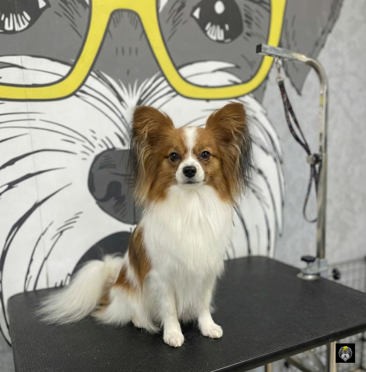 Папийон — изящная, жизнерадостная и очень умная собака. Благодаря своим большим ушам, напоминающим крылья бабочки, эта порода выглядит особенно эффектно и легко узнаётся. Папийоны отлично подходят для городской жизни, быстро обучаются и сильно привязываются к хозяину. При всей своей миниатюрности они требуют регулярного и аккуратного ухода за шерстью. В груминг салоне PetsLab мы хорошо знаем особенности папийонов и помогаем сохранить их красоту и здоровье. Особенности шерсти папийона Шерсть у папийона длинная, тонкая, шелковистая, без подшёрстка. Она не линяет обильно, но легко путается, особенно за ушами, на груди, животе и на лапах. Именно в этих зонах чаще всего образуются колтуны. Отсутствие подшёрстка делает шерсть более уязвимой к загрязнениям и сухости, поэтому гигиенический уход для папийона должен быть регулярным и деликатным. Нужна ли стрижка папийону Папийона не стригут коротко и не сбривают шерсть. Основная задача груминга — сохранить естественную длину и лёгкость шерсти,
