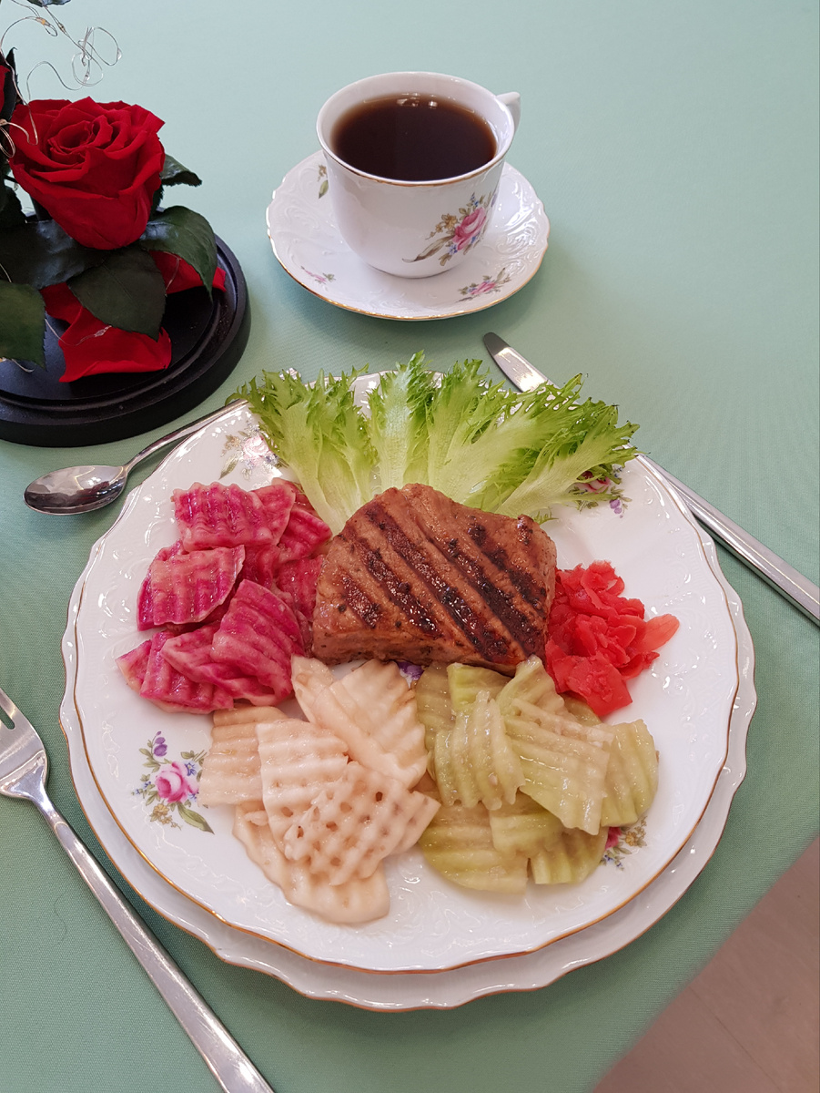 Добрый день, дорогие друзья! Сегодня я представляю вашему вниманию красочную закуску из трех видов редьки. Ароматный маринад придаст редькам приятный вкус за одну ночь в холодильнике и позволит изящно дополнить свинину приготовленную на гриле. Для приготовления 8 порций нам понадобятся: 1 редька арбузная весом 330 грамм, 1 редька маргеланская весом 330 грамм, 1 редька красная весом 330 грамм, свежий имбирь 45 грамм, соль 20 грамм, свежий чеснок 20 грамм, перец сычуаньский 15 грамм, соевый соус 60 грамм, рисовый уксус 30 грамм, подсолнечное масло 60 грамм. Для оформления 8 порций нам понадобятся: 1,3 килограмма свинины на гриле, 40 грамм маринованного имбиря, 80 грамм листьев салата. Приготовление: имбирь очистить и нарезать мелкой соломкой. В ёмкость к имбирю добавить рисовый уксус и соевый соус. Редьку очистить и разрезать на 4 части. С помощью специального ножа нарезать редьки на пластинки толщиной 5 миллиметров. Если такого ножа нет, можно нарезать редьки соломкой или плоскими пл