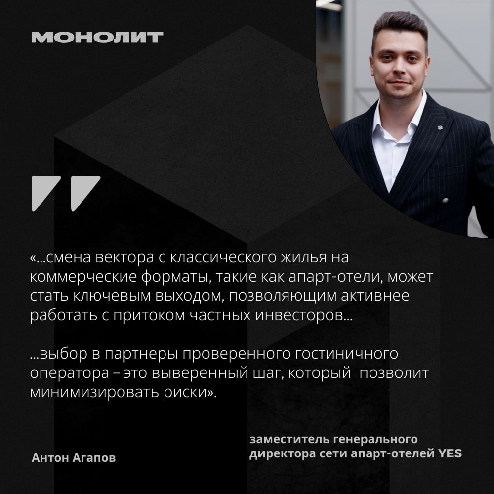 👤Прогнозы для рынка недвижимости на 2026 🗣Мнение Антона Агапова, заместителя ген. директора сети апарт-отелей YES: На мой взгляд, в 2026 году ожидается поляризация рынка недвижимости. Традиционный рынок жилья, будет оставаться в состоянии сжатия из-за дорогой ипотеки и снижения потребительского спроса, что для девелоперов означает эпоху дорогих денег и необходимость выживания. В этой ситуации сегмент апарт-отелей может стать новой точкой роста и стратегической альтернативой. В отличие от жилья, этот сегмент показывает стабильный рост, опережая прошлогодние показатели на 5-6%. Для застройщиков, которые «не могут не строить», смена вектора с классического жилья на коммерческие форматы, такие как апарт-отели, может стать ключевым выходом, позволяющим активнее работать с притоком частных инвесторов, переориентирующихся с классических квартир с низкой доходностью на отельную недвижимость с высоким и понятным стабильным пассивным доходом. Важно отметить, что выбор в партнеры проверенно