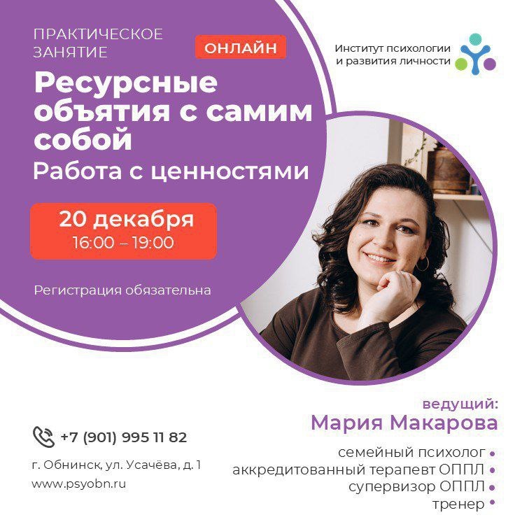 Институт психологии и развития личности приглашает на новогоднее ОНЛАЙН занятие-семинар! 🎄 РЕСУРСНЫЕ ОБЪЯТИЯ С САМИМ СОБОЙ. РАБОТА С ЦЕННОСТЯМИ 😻😻😻😻 На занятии вы: 1️⃣ Соберёте свои важные ценности, многих из них рождаются из потребностей и очень весомы, значимы в вашей жизни 2️⃣ Определите влияние ценностей друг на друга и их связи 3️⃣ Почувствуете и наполните свою жизнь самым ценным ⏰ 20 декабря I 16:00 - 19:00 МСК Формат: онлайн 💰 Стоимость участия до 15 декабря: 2000 ₽ Стоимость участия после 15 декабря: 3000 ₽ Регистрация ЗДЕСЬ ↖️ Подробнее о мероприятии: https://t.me/psy_institut_obninsk 🎄 Ждём вас на нашем праздничном семинаре! 🎀🎀🎀🎀 👍 Подписаться | Ваша реклама