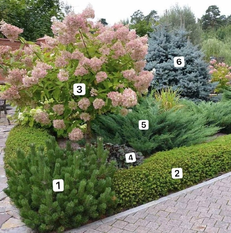 Яркий насыщенный миксбордер. ⠀ 1. Сосна горная 2. Бордюр из спиреи японской 3. Гортензия метельчатая Ванила Фрейз 4. Гейхера 5. Можжевельник казацкий 6. Ель голубая Больше советов тут, подписывайтесь: 🏡 ДАЧА в Телеграмм 🏡 ДАЧА на Дзен 🏡 ДАЧА во ВКонтакте