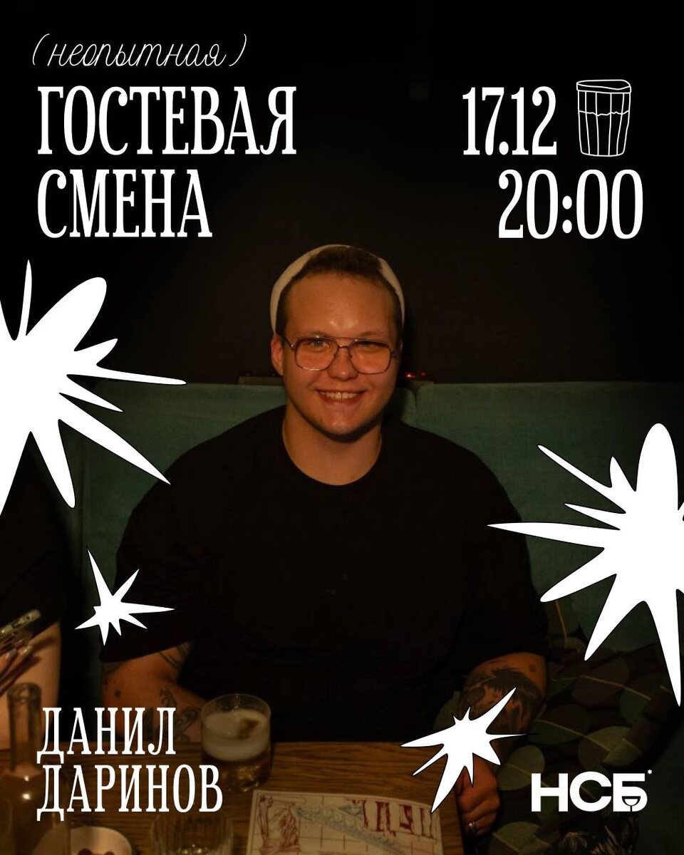 🥃 Врываемся в наши НЕопытные гостевые смены! 17 декабря за барной стойкой НСБ вас будет ждать душа любой компании — Данил Даринов! Даня — жданный гость в нашем баре, тот самый друг, который знает, как создать незабываемую ночь в твоей жизни. Говорим по секрету: обожает угощать и гарантирует, что никто не останется без внимания и хорошего коктейля. Его страсть — джин, и поэтому вас ждёт специальная джин-карта от Данила! Приходите пробовать его авторские интерпретации на легендарные коктейли! 🍸 Мы ждём всех 17 декабря в 20:00 — пробовать лучшие джинные коктейли, созданные с душой от Данила Даринова! Будет тепло, весело и очень гостеприимно. Бронируй столик по ссылке 🥳Ул. Розы Люксембург 8 | 10 📞8 (912) - 034 - 28 - 68