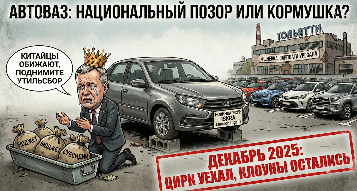 Друзья, ну что, декабрь 2025 года на дворе, а АвтоВАЗ всё так же в глубоком дерьме! Продажи рухнули на 25-27%, производство в Тольятти сократили на 40% (до жалких 274-300 тысяч ведер), завод успел побыть на четырёхдневке, рабочие сваливают из-за урезанных, до 40 тысяч, зарплат, а великий и ужасный Максим Соколов — этот король нытья и профессиональный попрошайка — опять винит всех подряд: "вялый рынок", "демпинг китайцев перешёл все мыслимые границы" (скидки до миллиона — ужас-ужас!), требовательные россияне, высокая ставка ЦБ, злые санкции... Всё, кроме себя и своей банды бездарей! А сами тем временем сосут субсидии сотнями миллиардов из бюджета, обещают "прорывы" и "новинки", а на выходе — ржавеющие перелицованные румынские Dacia по цене нормальных машин. Сегодня мы этот цирк разберём по косточкам с максимальным сарказмом, гневом и чёрным юмором — потому что достало по полной! Этот "национальный гигант" уже полвека кормит нас оправданиями, пока мы, налогоплательщики, спонсируем их бонусы, "инновации" на бумаге и вечный застой. Хватит молчать — давайте поржём и взорвём этот позор!